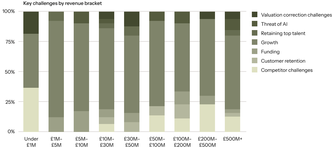 Among the smallest firms (under £1M), competitor challenges hold equal weight with growth, highlighting the pressures of establishing market position early on in a company's lifecycle. Funding concerns were largely confined to sub-£50M organisations, and in those cases, were only chosen as the primary challenge by circa 8% of the respondents. This suggests that this group of CFOs are either well-funded currently or, as our questions on funding revealed, feel confident in their ability to raise this year.Valuation correction challenges appear intermittently across mid-sized brackets, but remain eclipsed by growth concerns, reflecting a transitional stage of financial maturity.