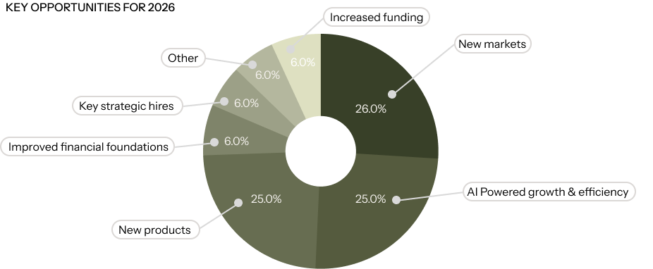 New markets, AI-powered growth and efficiency and new products were almost jointly ranked as the top opportunities in 2026, collectively chosen by just over 75% of our CFO cohort.